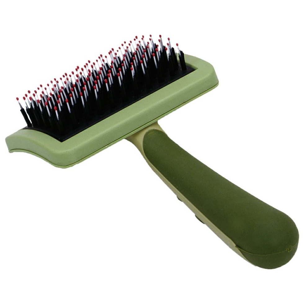Designed specifically for long-haired dogs, the Safari Complete Dog Brush provides the combined benefits of a firm slicker and bristle brush. The nylon coated tips remove excess undercoat, tangles, and loose hair for a healthy coat and home. The rubber fingers smooth, condition, and shine the coat. Brush in the direction of hair growth, from head to tail and then down the legs. Use long flowing strokes, separating the hair as needed. To fluff coat, brush against the direction of hair growth. Watch for mats behind the ears, on chest, stomach, and hind legs.